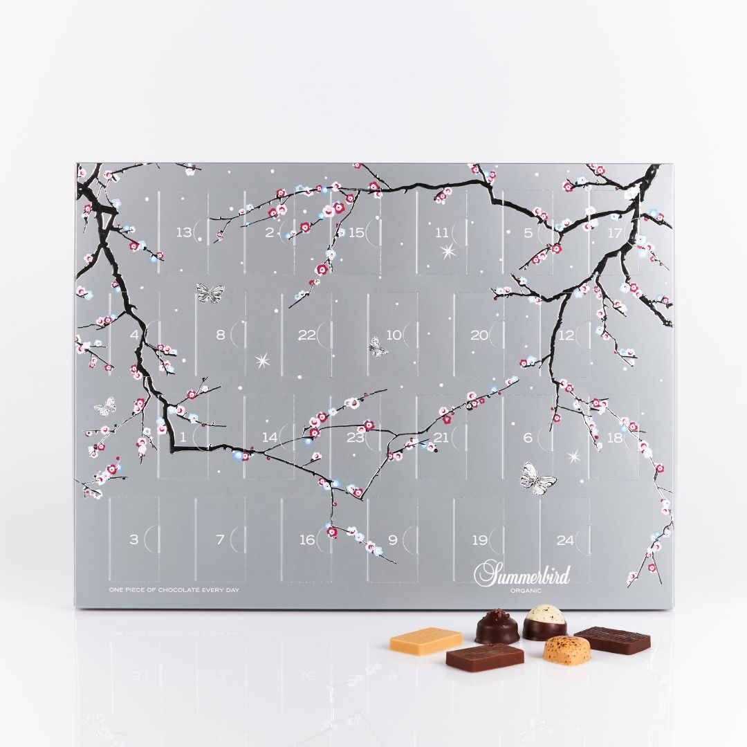 Julekalenderen med sølvmotiv er inspireret af det ikoniske tapet, som dekorerer alle Summerbird-Chocolaterier, og julekalenderen indeholder både smagfulde chokoladebarer og elegante, fyldte chokolader.